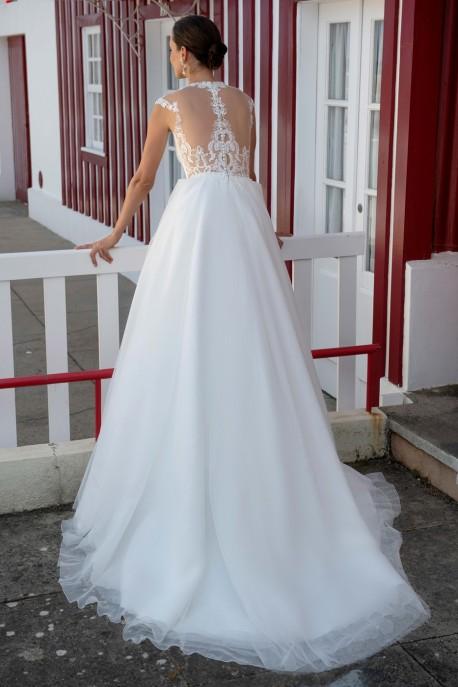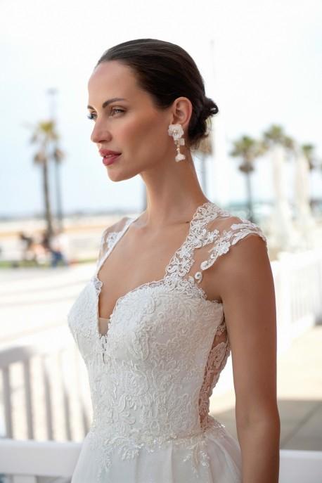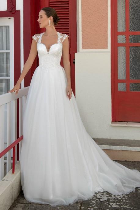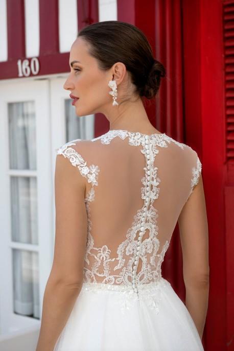 Robe de mariée en tulle pailleté et dentelle.