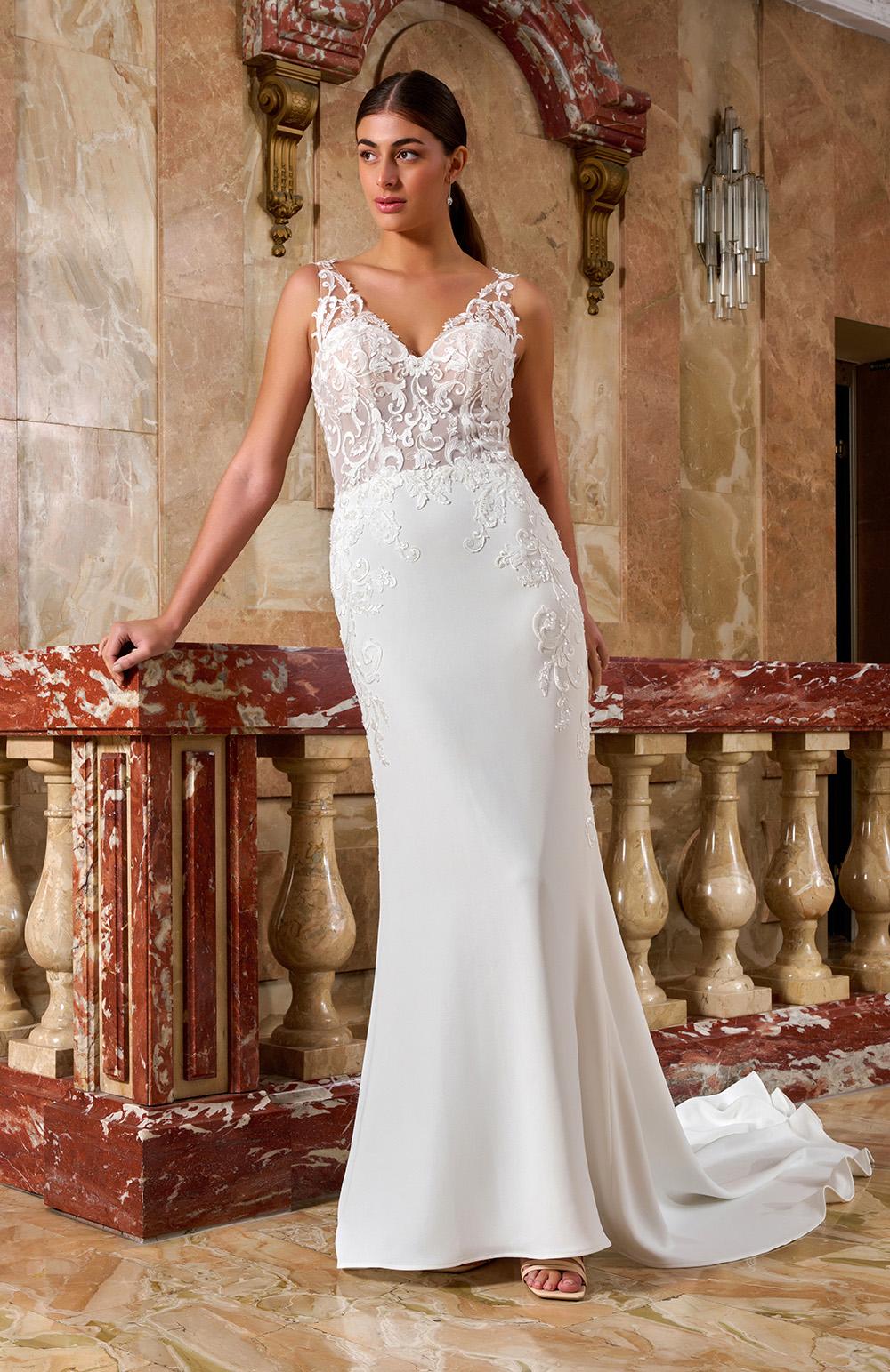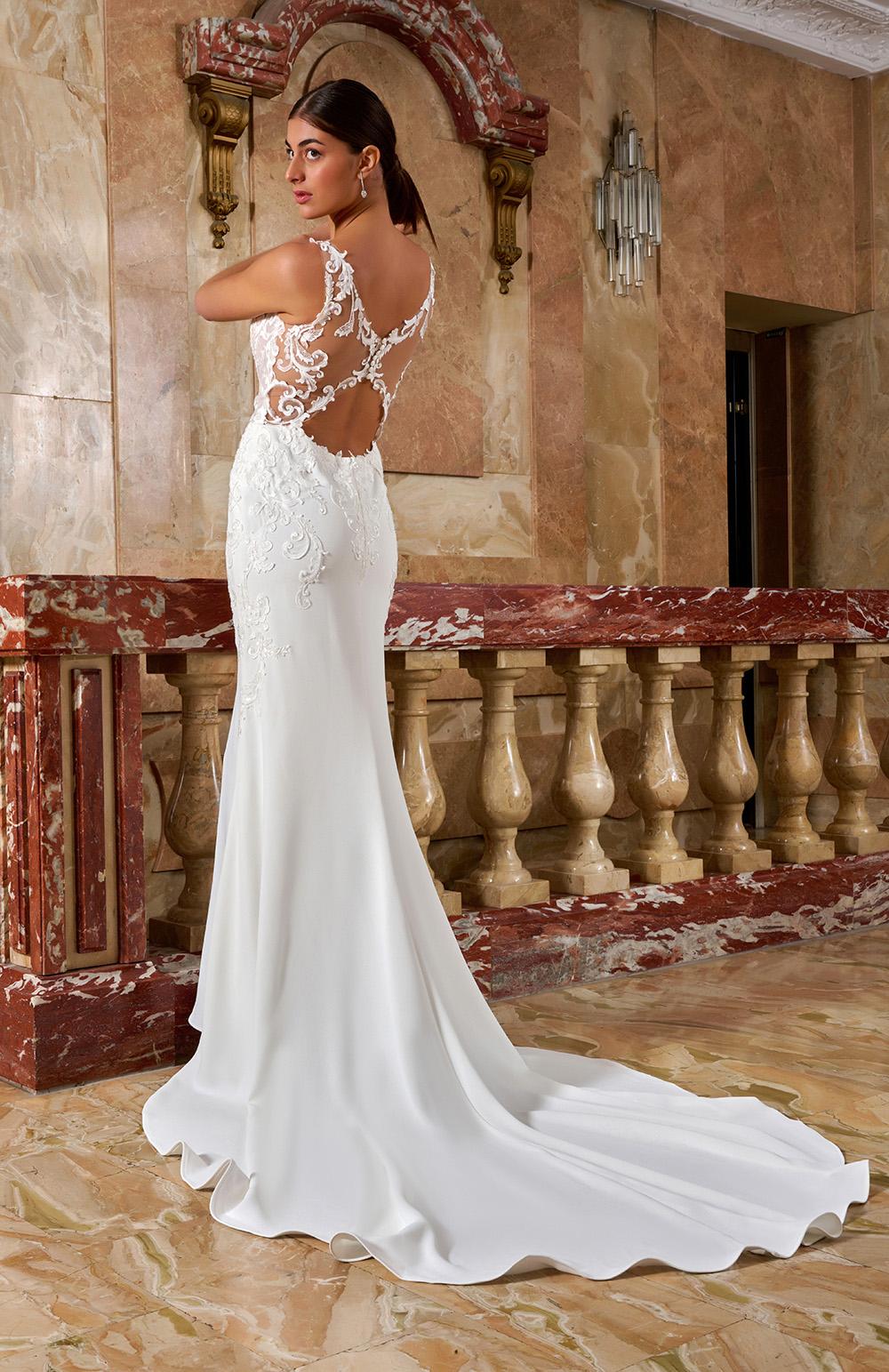 Robe de mariée en crêpe et dentelle.