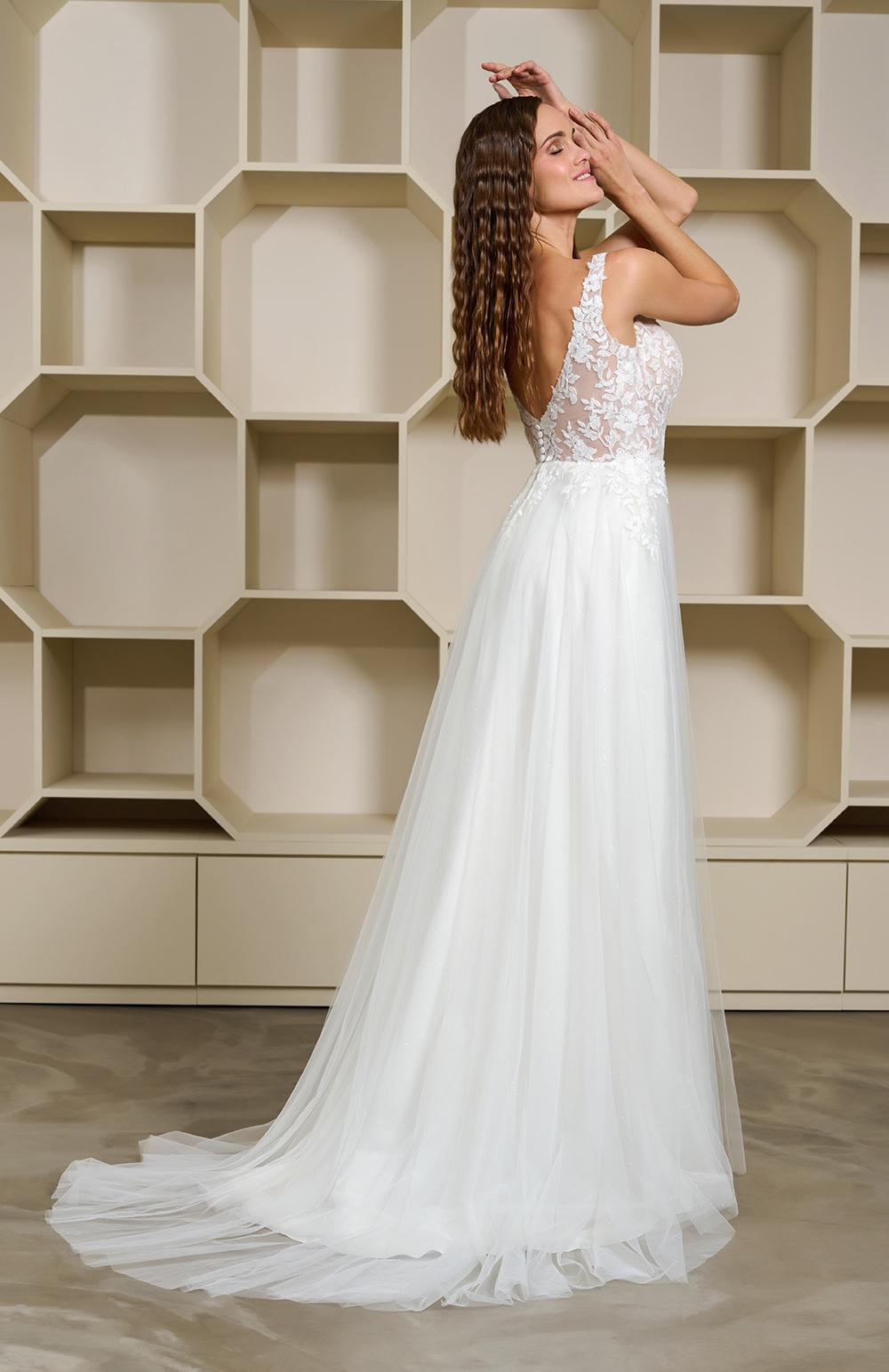 Dos nu « V » en transparences de dentelle, petits boutons.