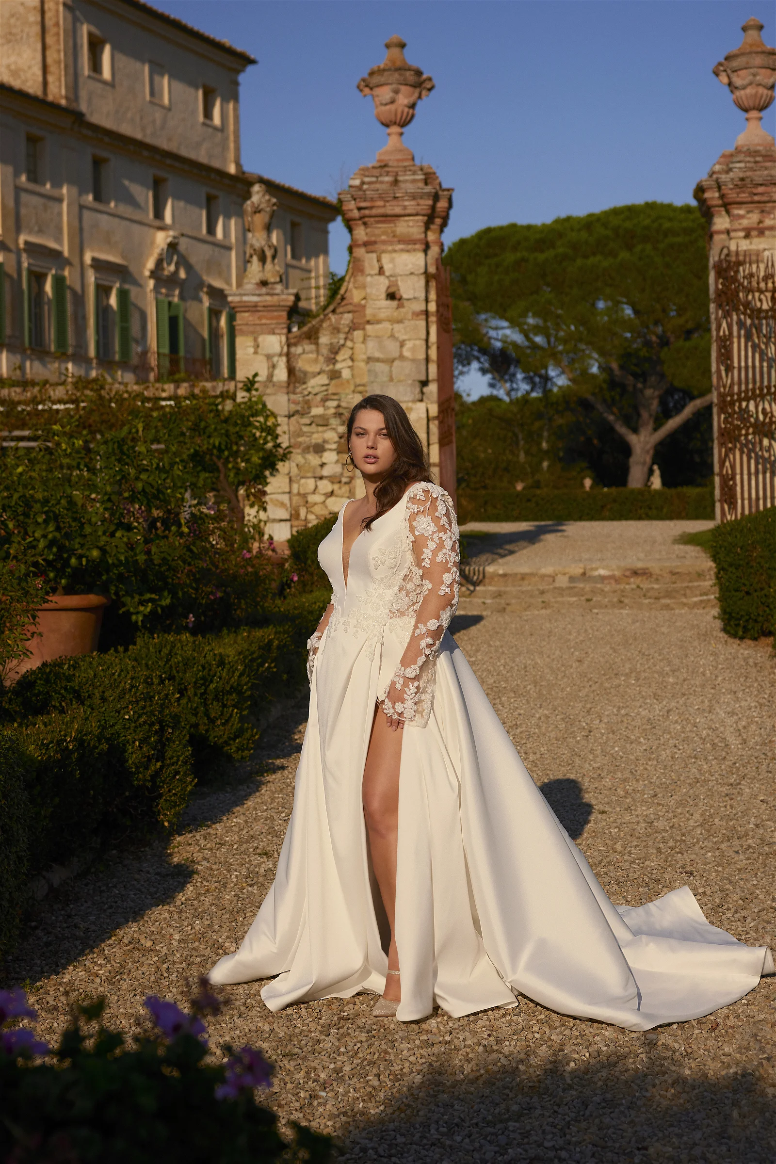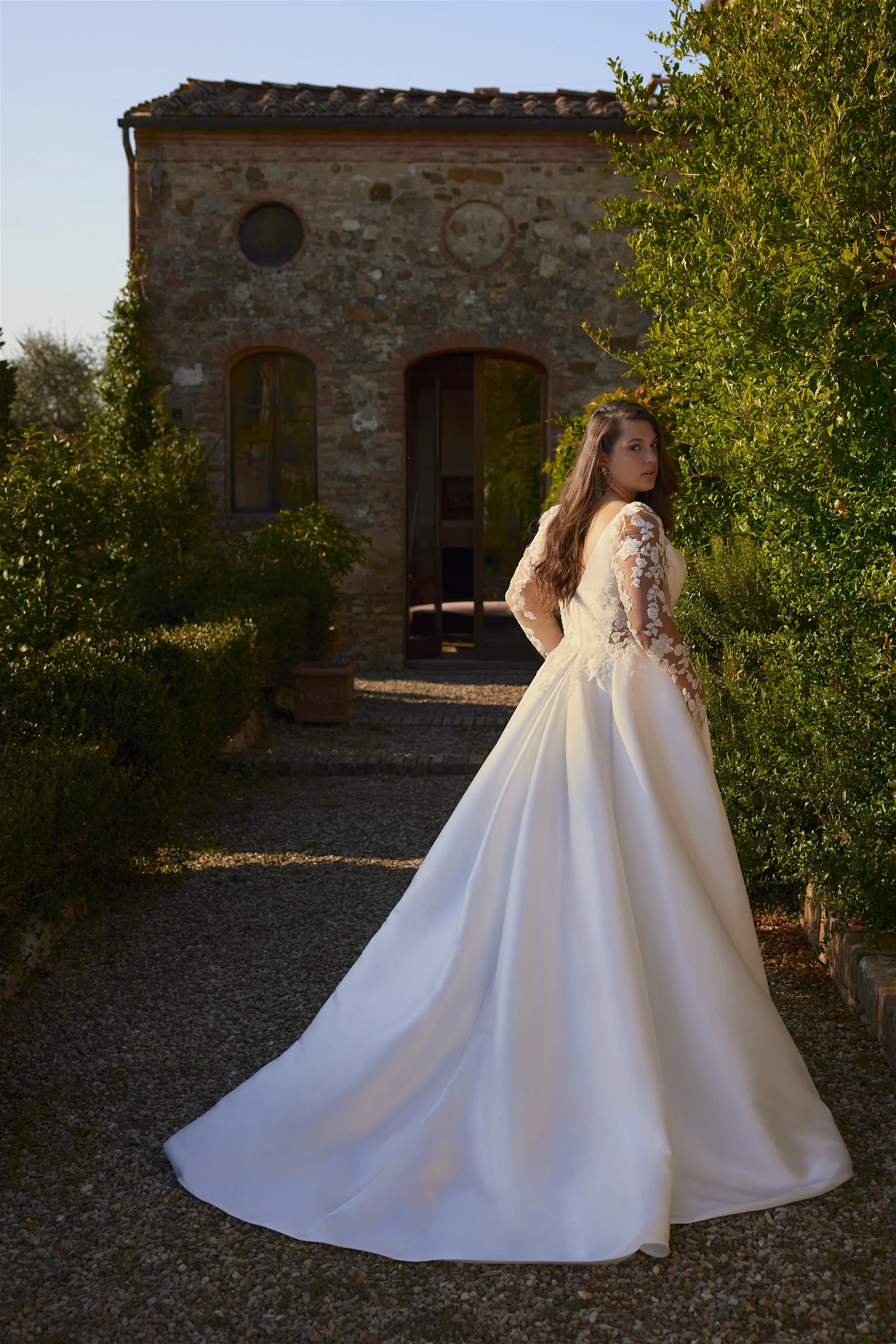 Robe de mariée en satin et dentelle.