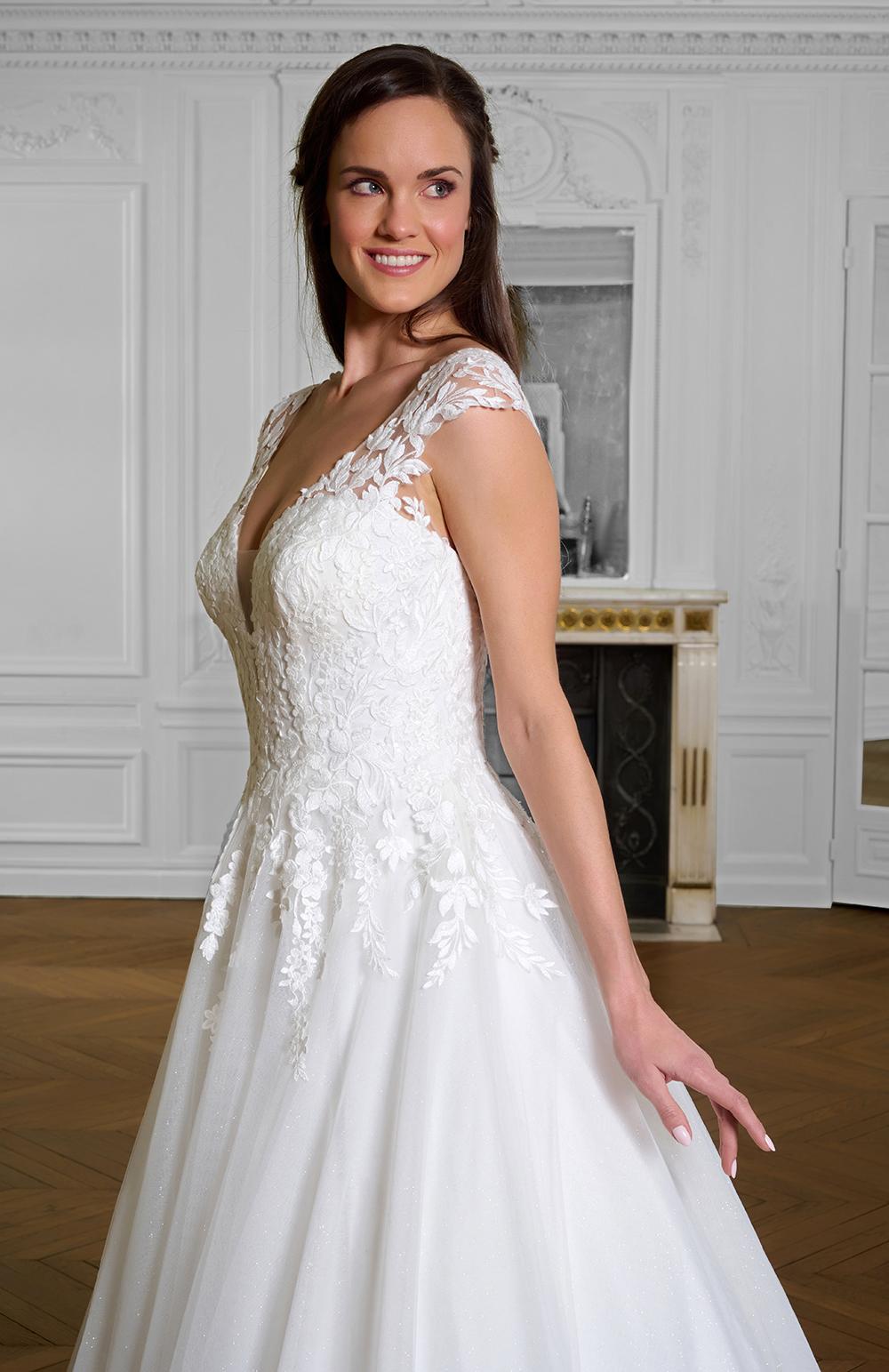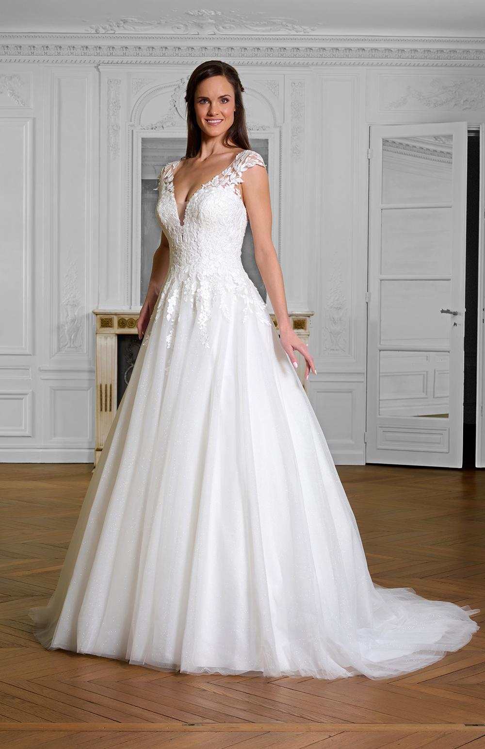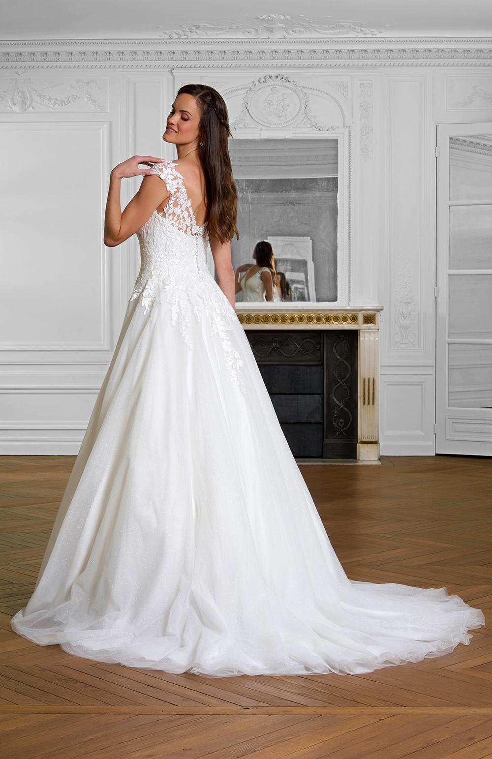 Robe de mariée en tulle et dentelle.