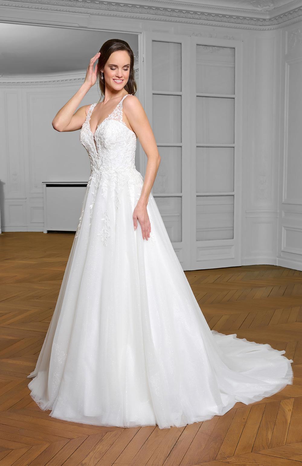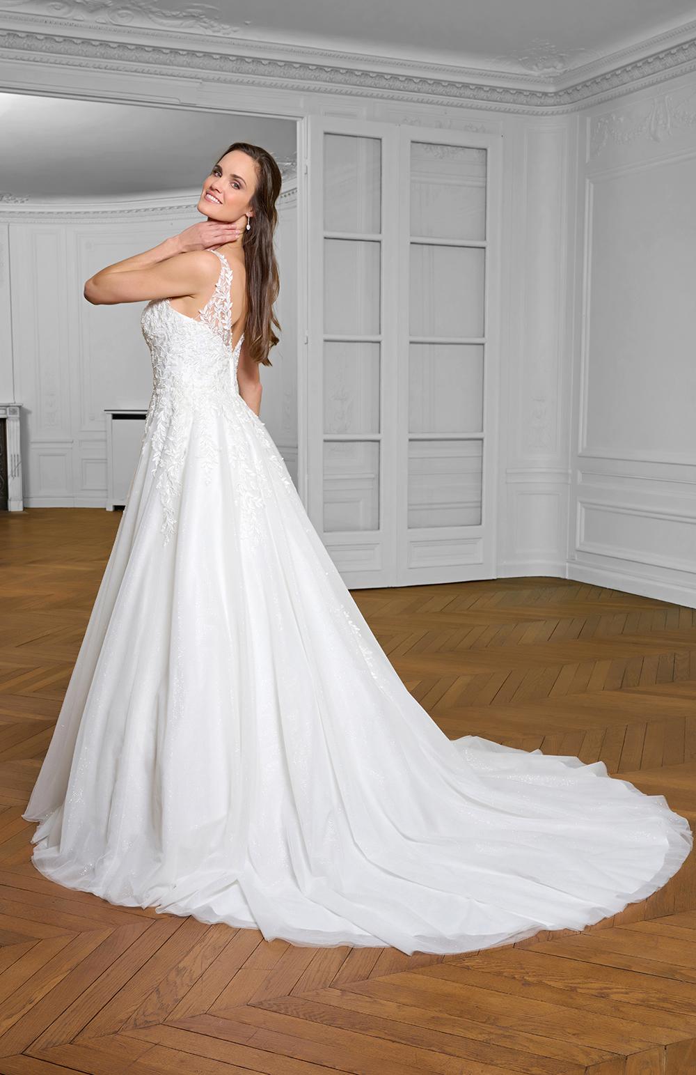 Bustier « V » en dentelle perlée et décolleté en transparence.