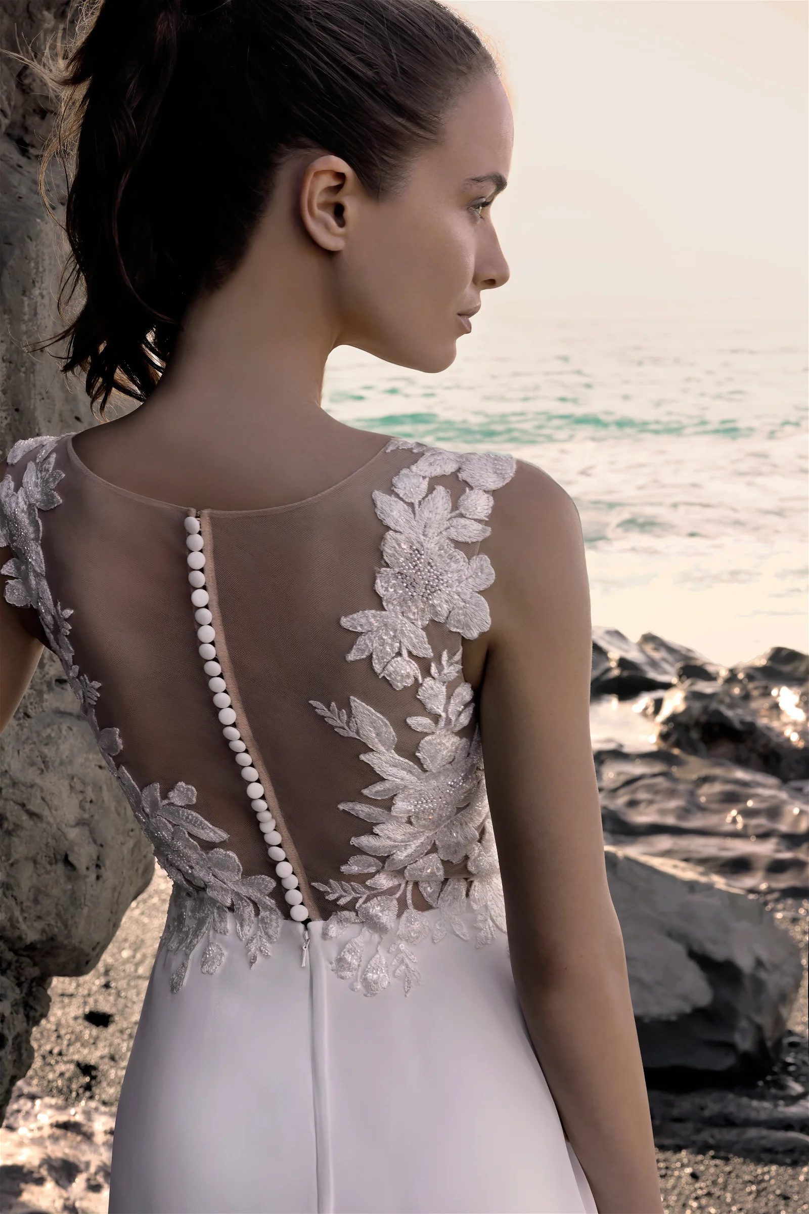 Dos en boutons transparent garni de dentelles perlées.