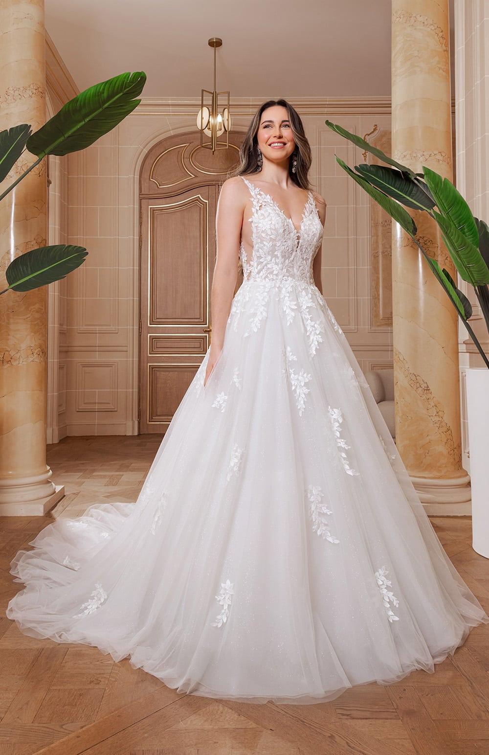 La jupe en tulle pailleté, légère et fluide, est parsemée d’élégantes appliques dentelle.