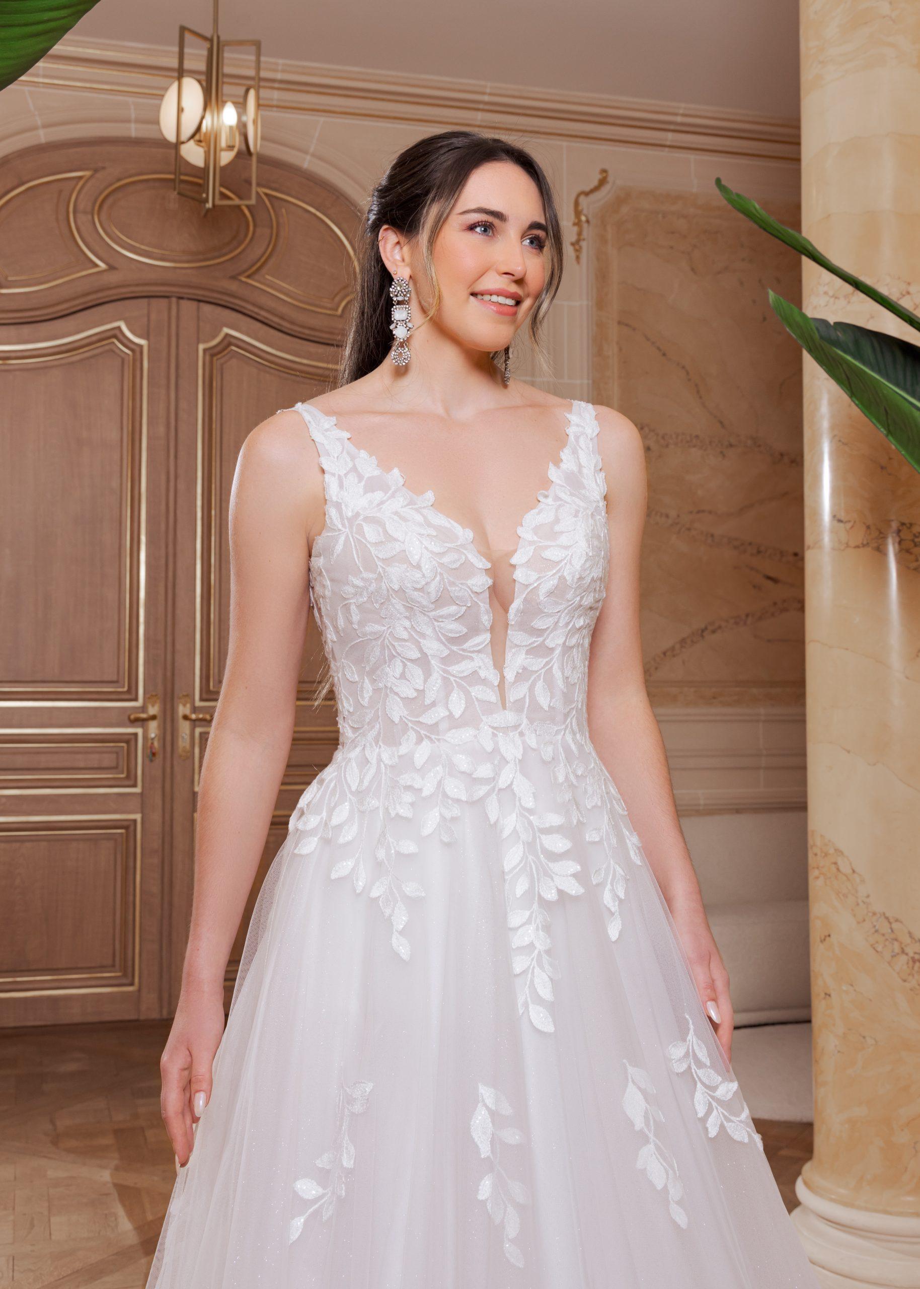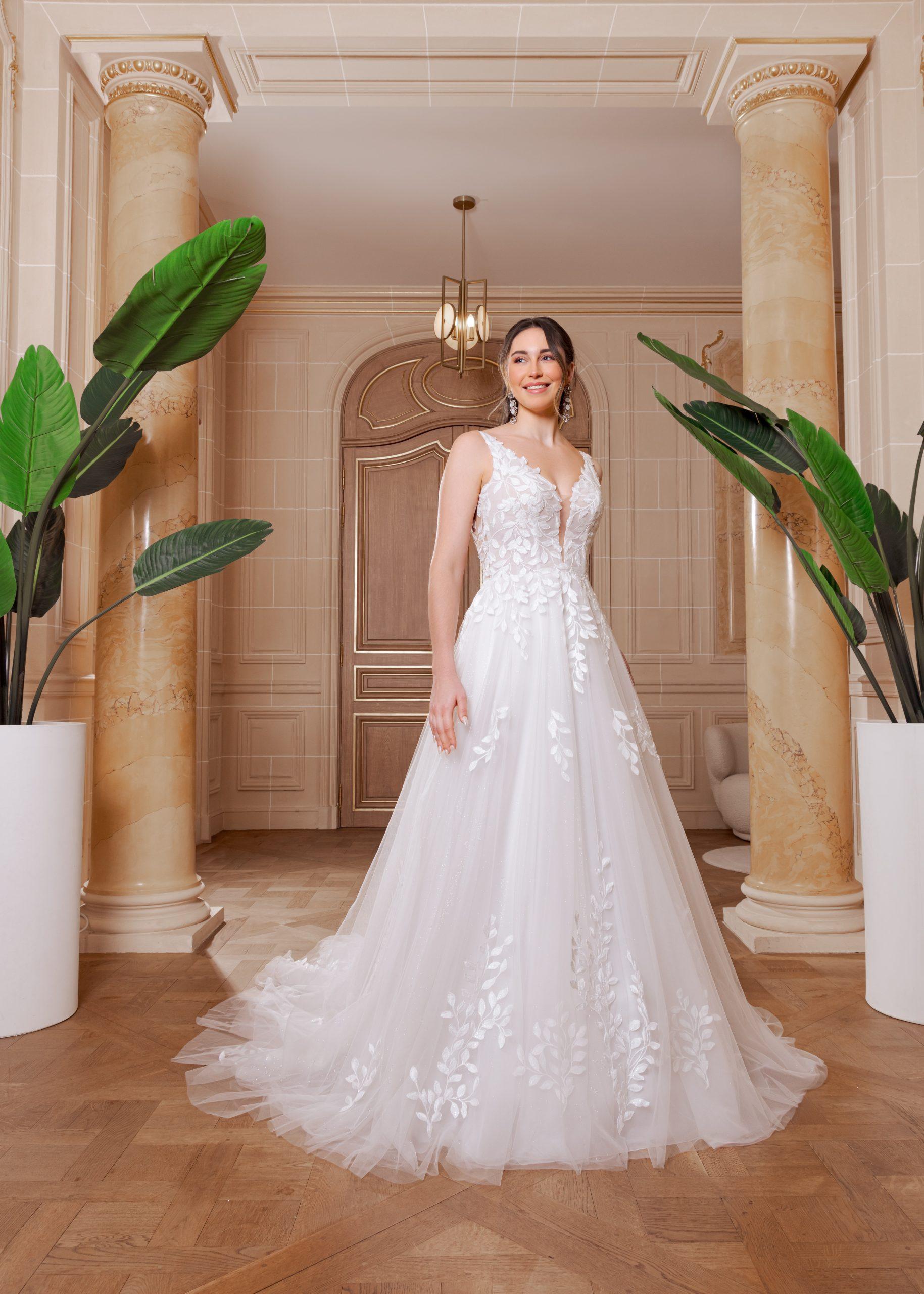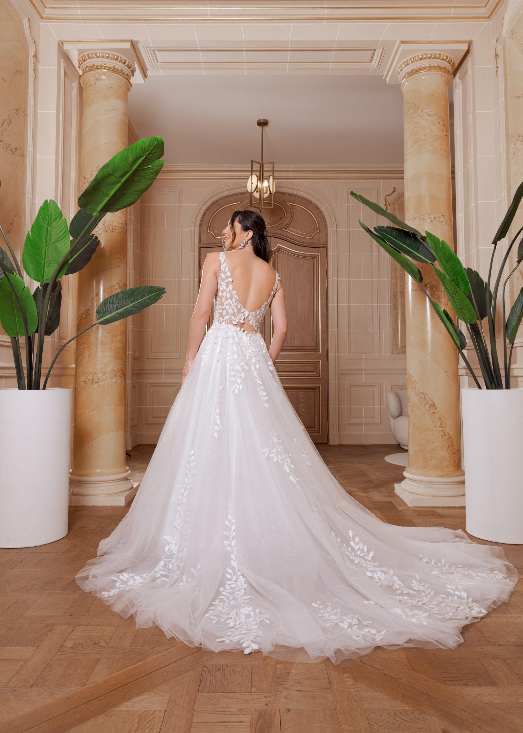 Sa jupe vaporeuse en tulle léger se pare d’appliqués floraux délicats qui s’épanouissent jusqu’à la traîne, dans un souffle de poésie.