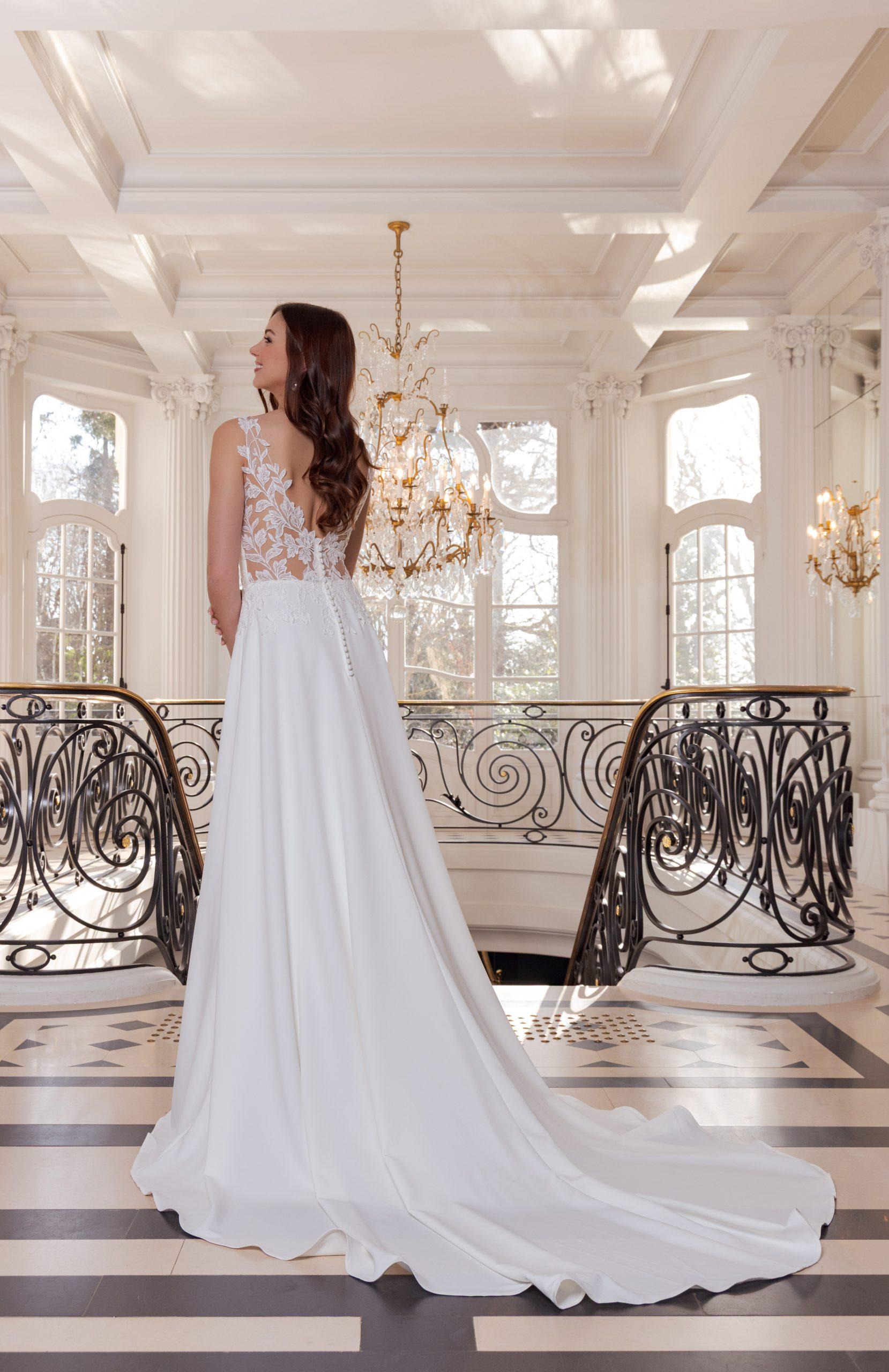 La jupe fluide en crêpe et la traîne longue complètent avec grâce cette silhouette intemporelle.