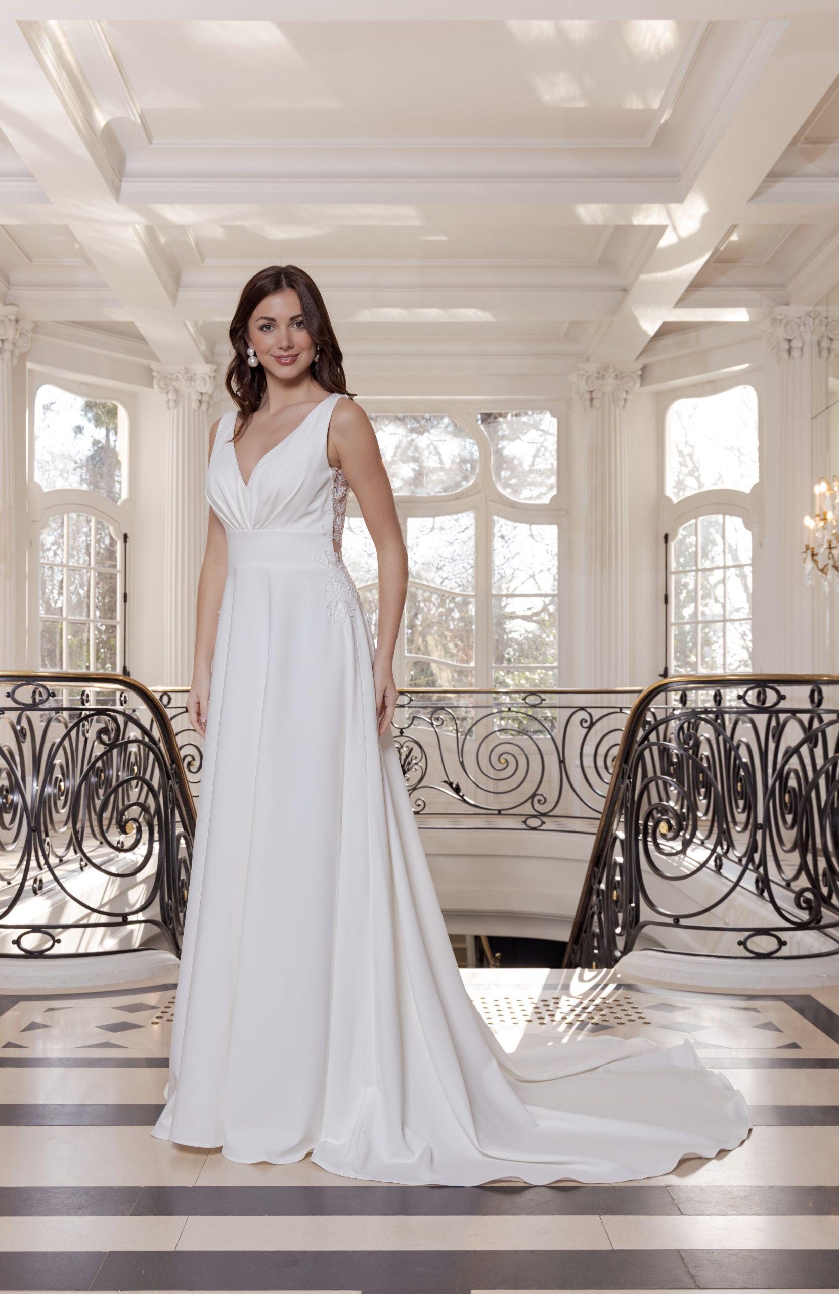 Natasha est une robe de mariée au charme épuré, sublimée par un profond décolleté en V et une taille marquée par un effet ceinturé.