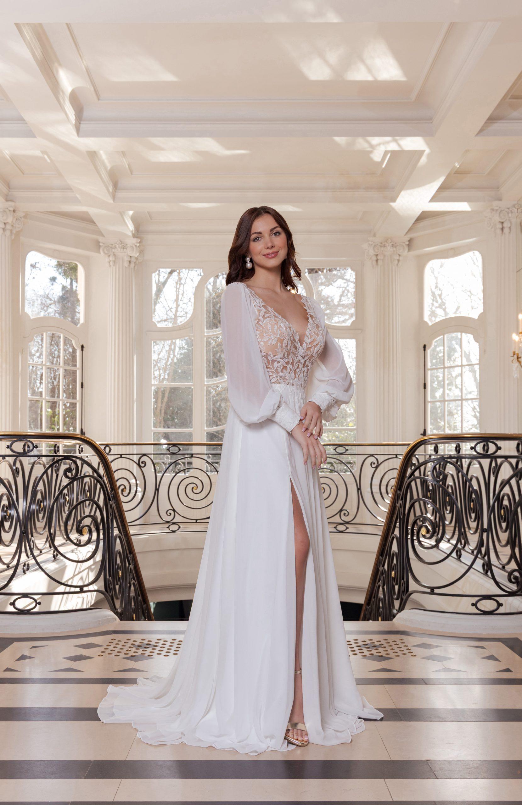 Les manches longues bouffantes en mousseline, amovibles, ajoutent une touche aérienne et romantique à cette silhouette poétique.
