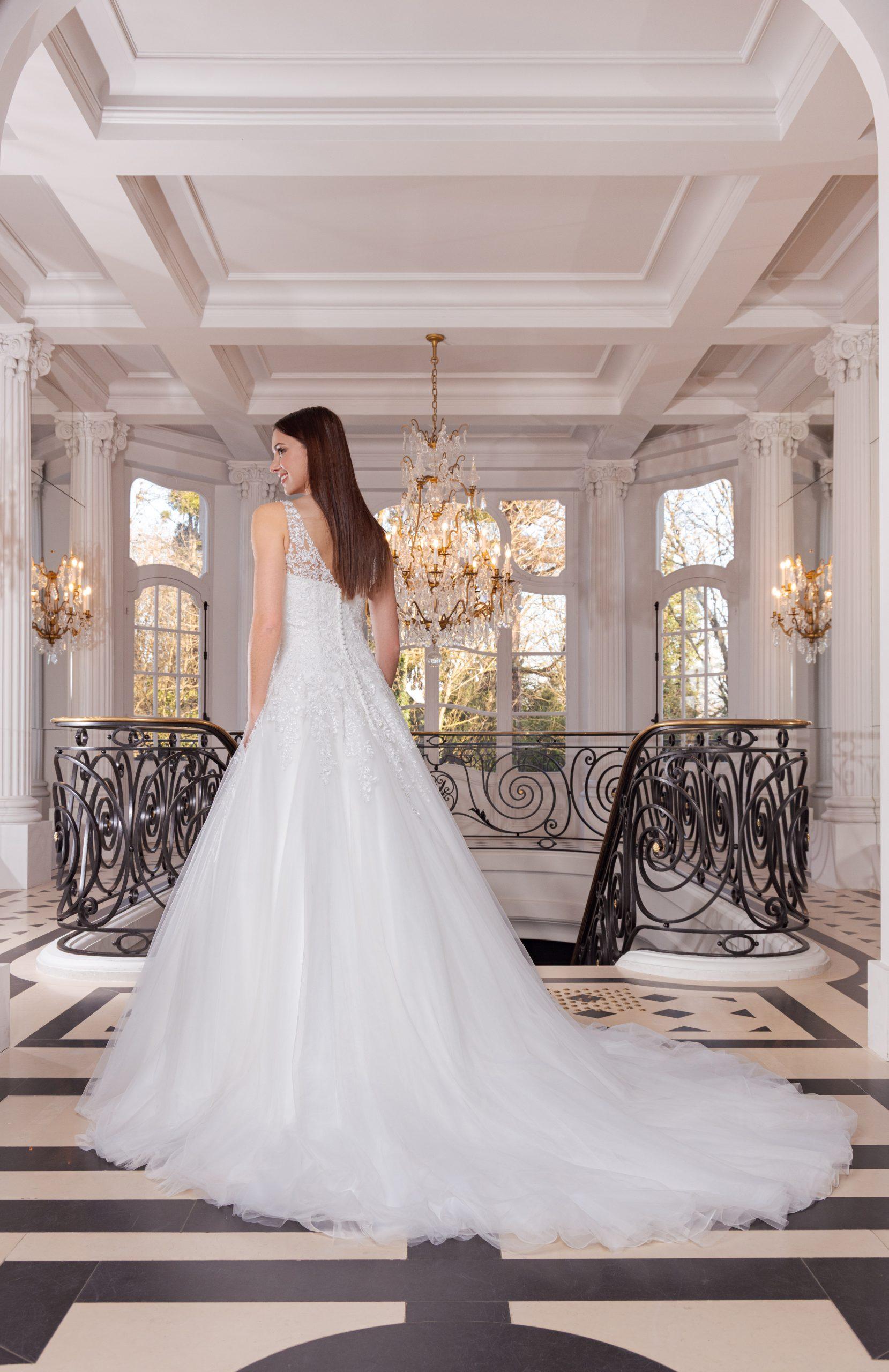Au dos, une élégante rangée de boutons complète ce modèle d’une grâce intemporelle.
