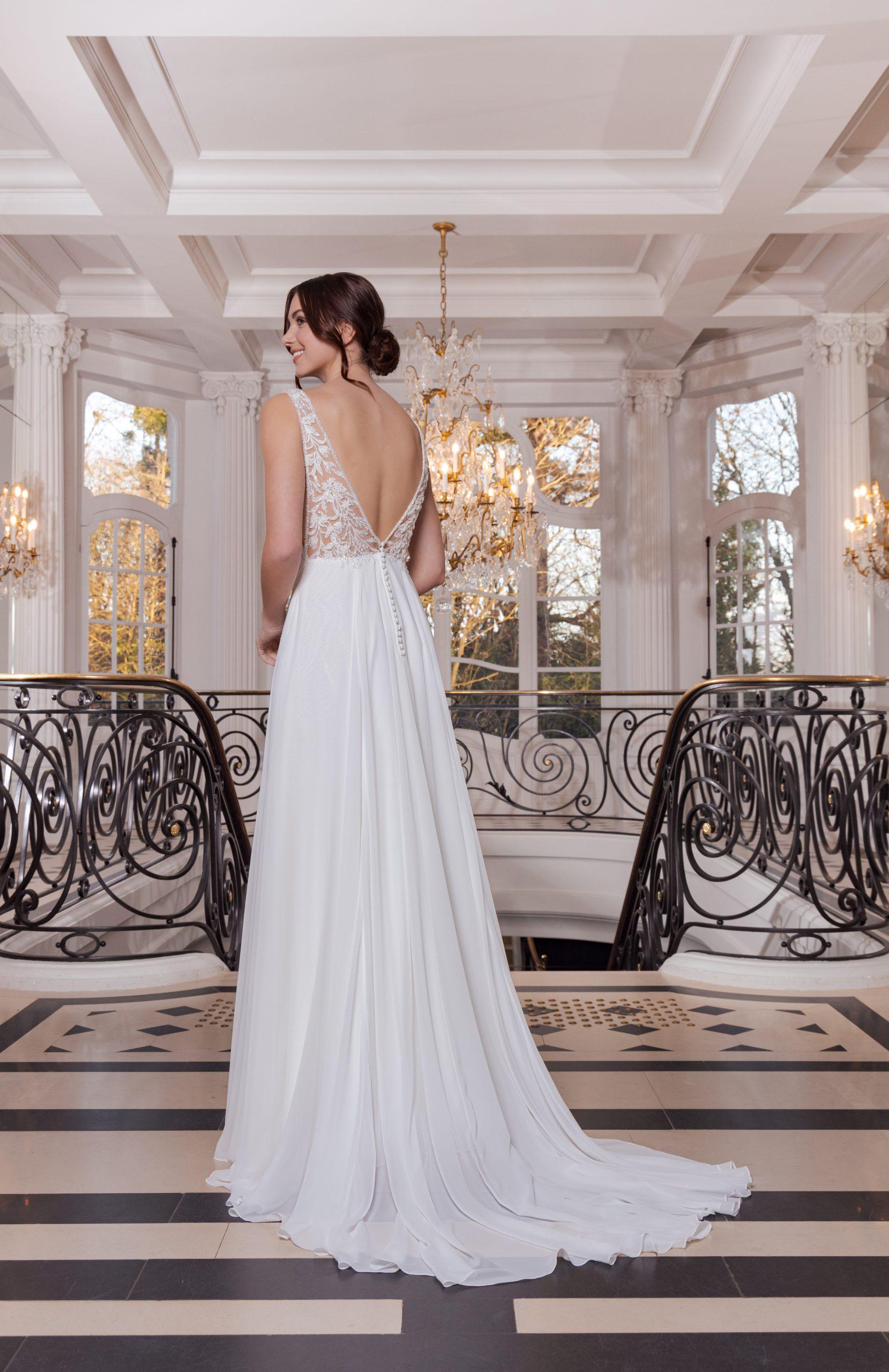Au dos, une encolure en V plongeante s’accompagne d’une discrète rangée de boutons, sublimant la chute fluide de la jupe en mousseline.