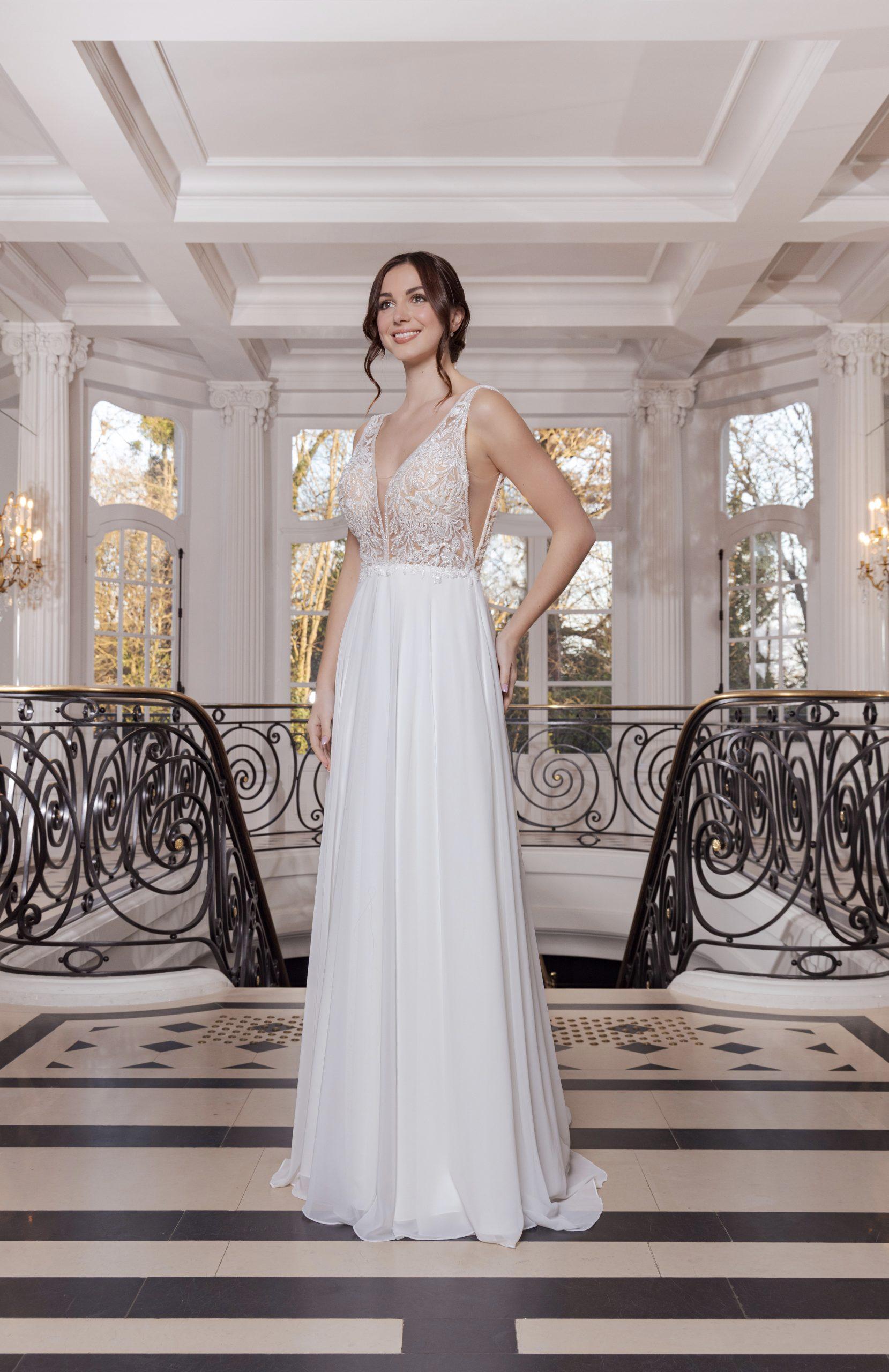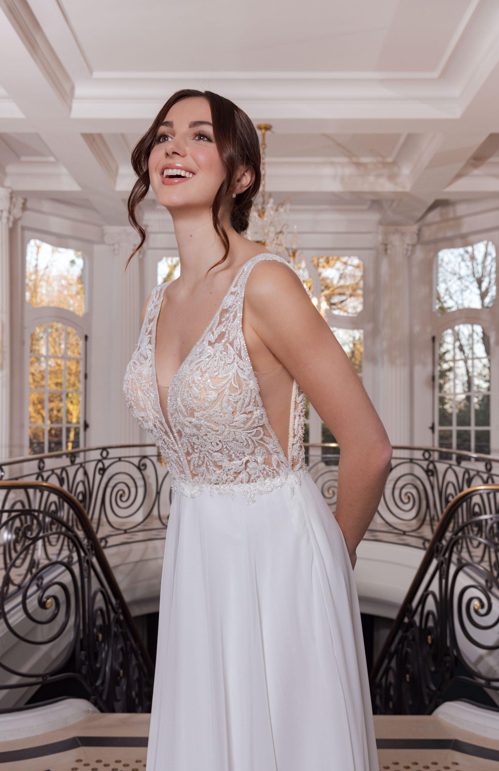 Noa est une robe de mariée élégante et aérienne, dont le corsage en tulle illusion est brodé de perles fines et souligné d’un galon perlé délicat le long du décolleté.
