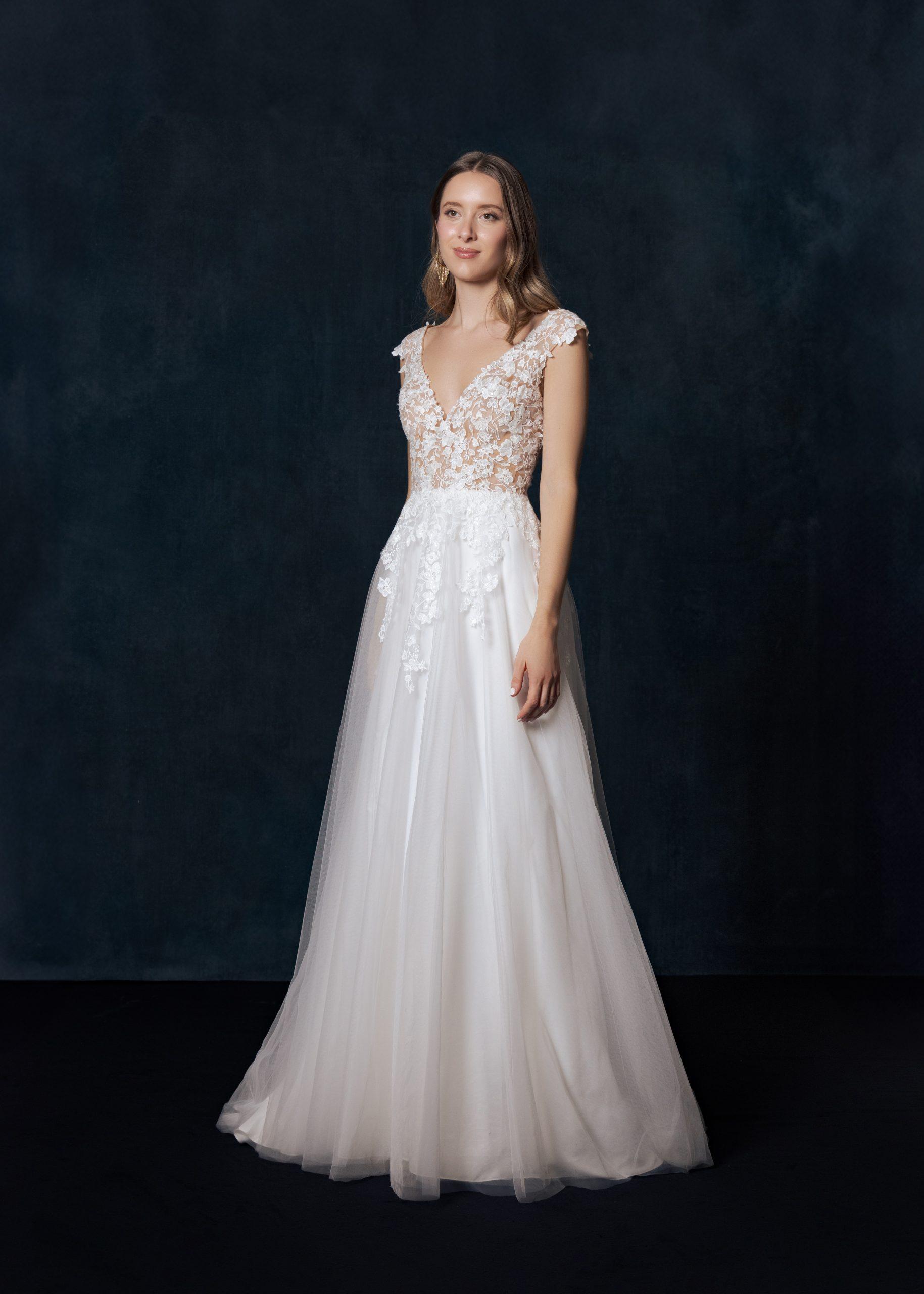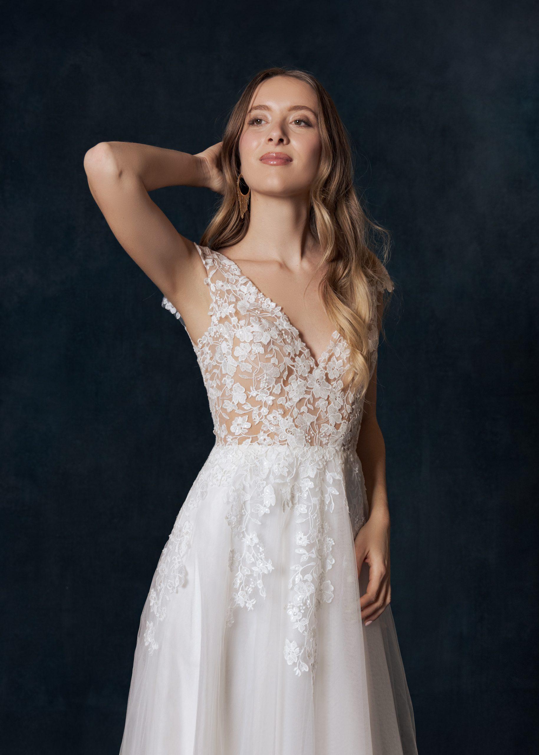 La robe Valeria séduit par son corsage en tulle illusion, brodé de fleurs délicates serties de sequins discrets.