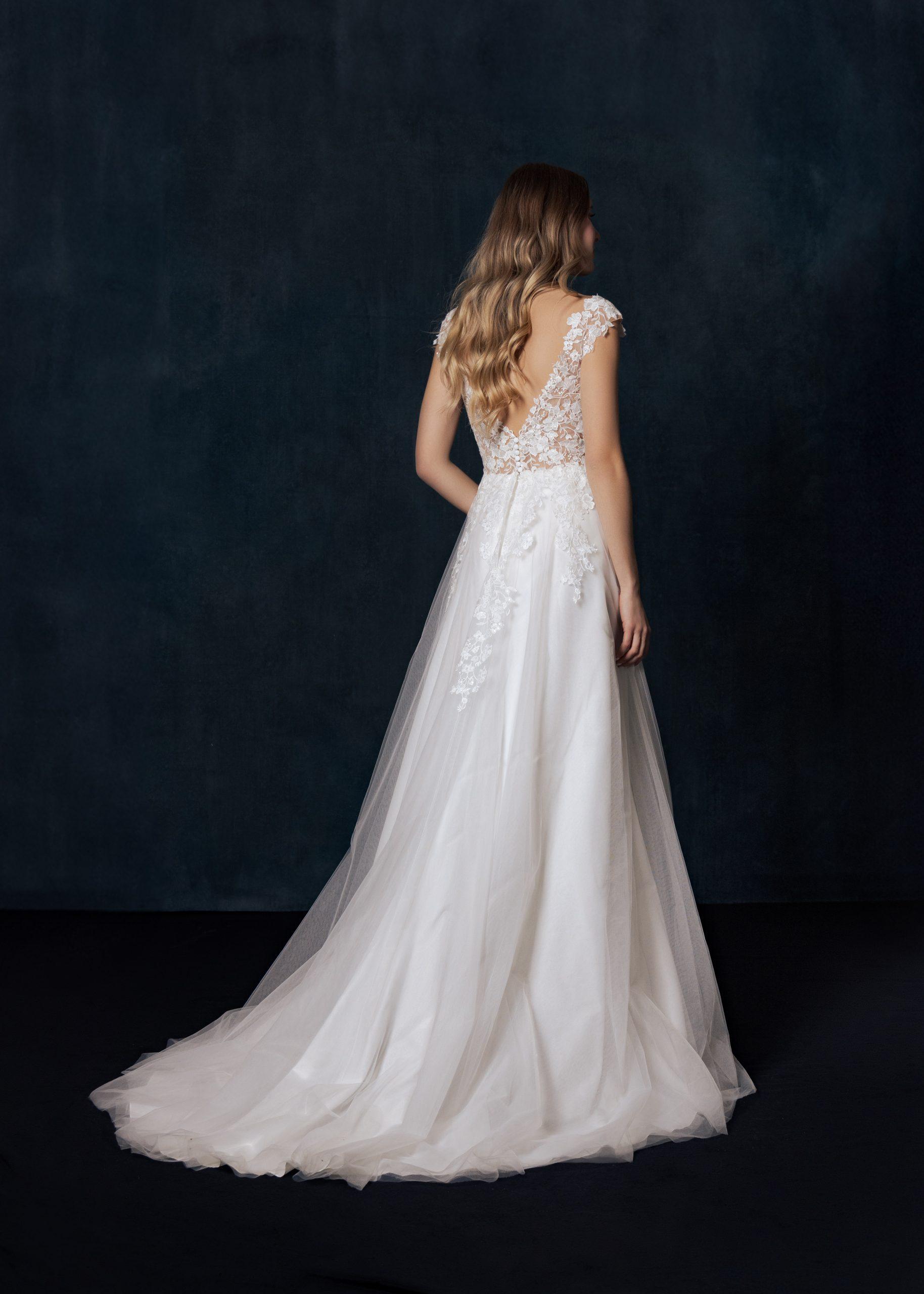 La jupe en tulle, légère et vaporeuse, s’étire en une traîne au tombé naturellement gracieux.