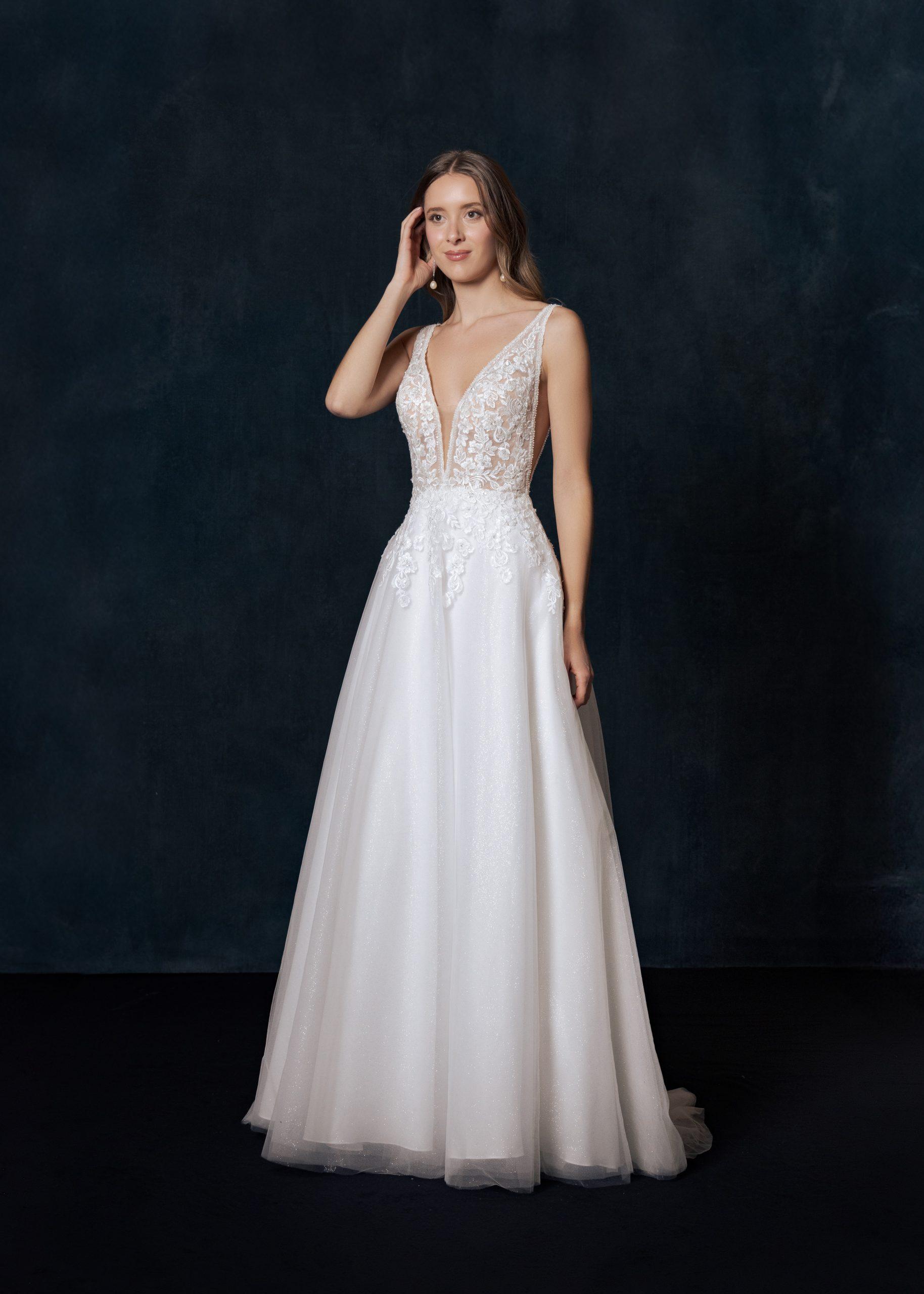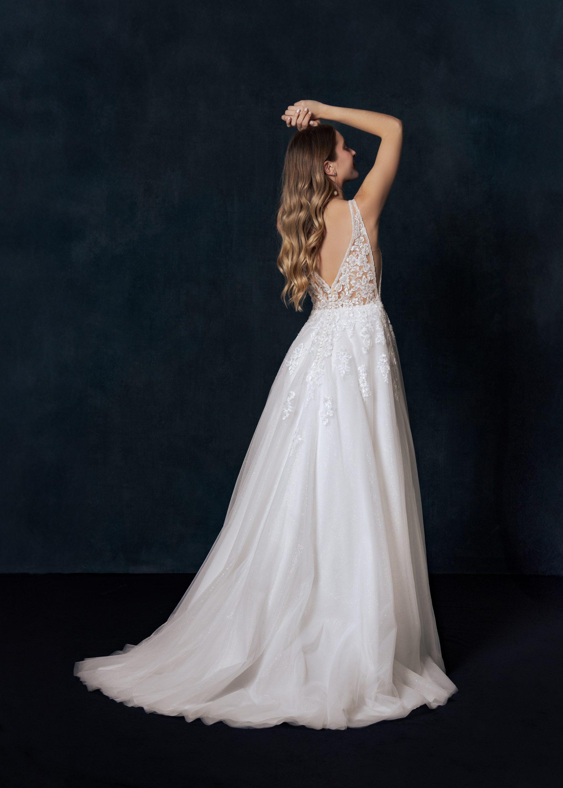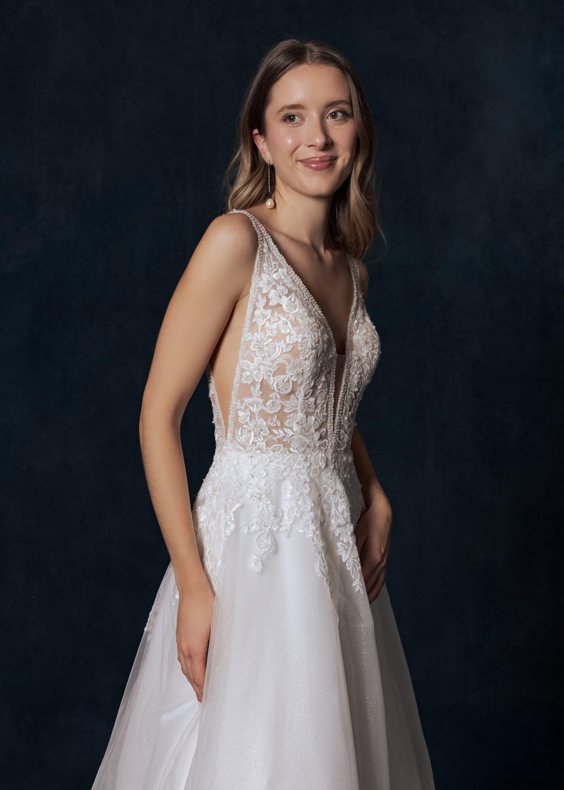 La robe Valeska séduit par son buste en tulle orné d’appliques de dentelle perlées, sublimées par une encolure plongeante bordée de perles délicates.